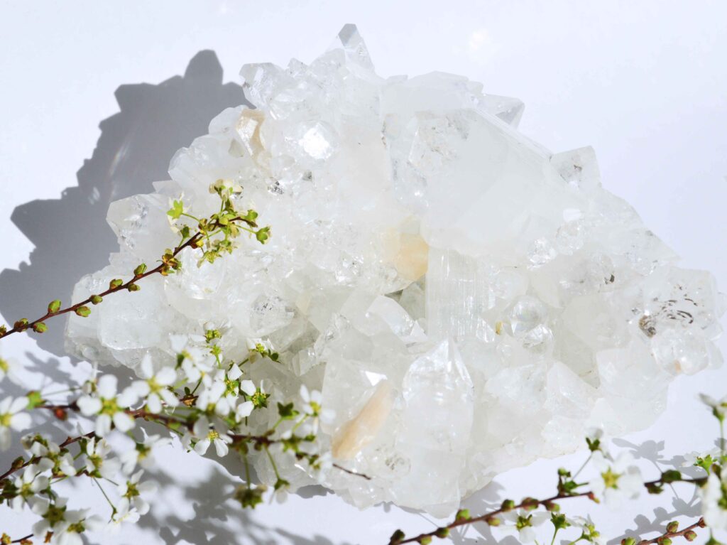 アポフィライトクラスターは、ガラスのような透明感と美しい結晶面が特徴の鉱物で、主にフッ素を含む珪酸塩鉱物(KCa₄Si₈O₂₀(F,OH)·8H₂O)に分類されます。