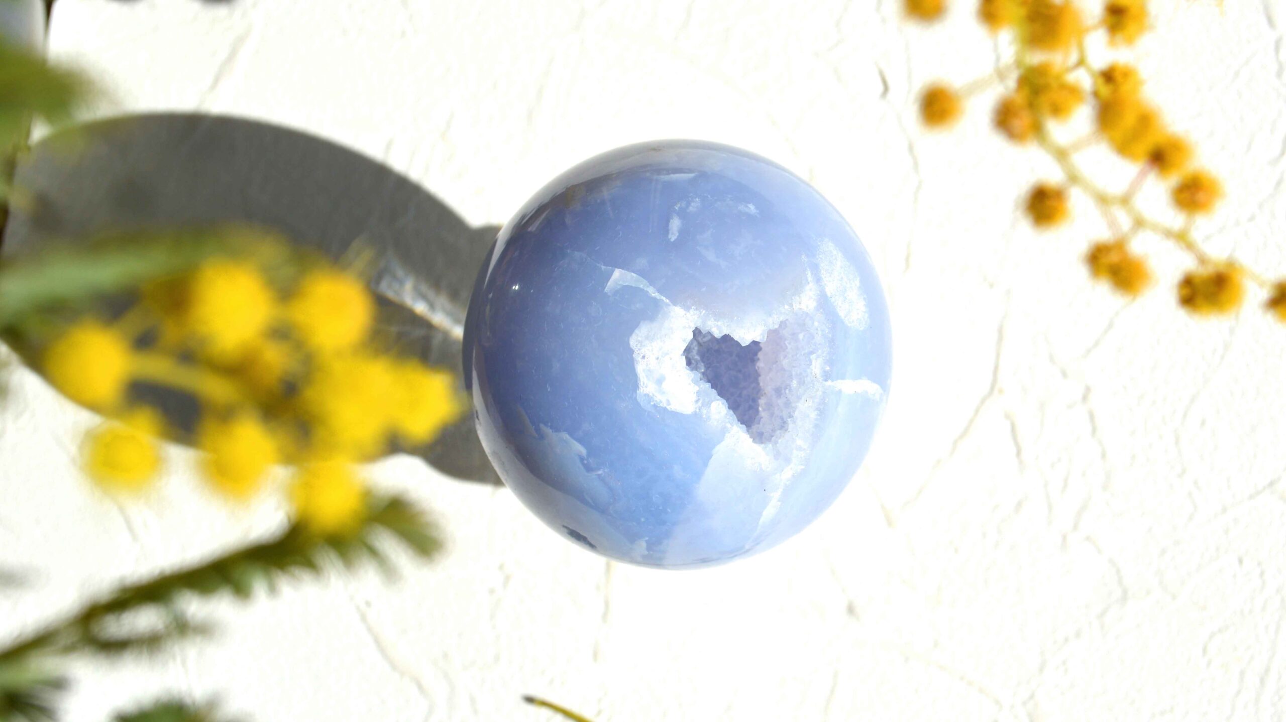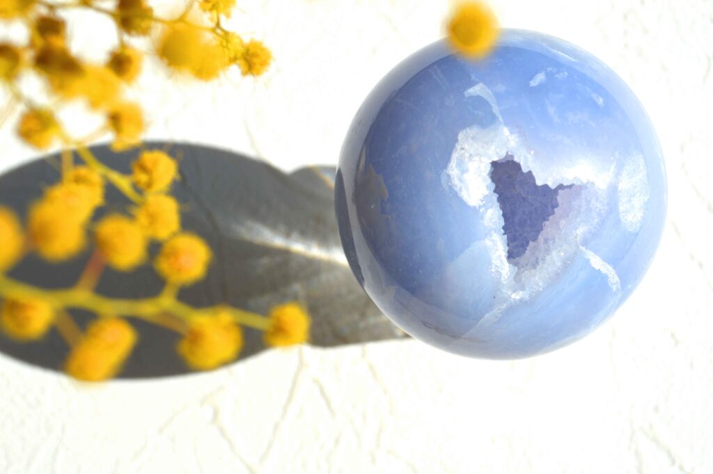 ブルーレースアゲートのスフィアは、空を思わせる淡い水色の縞模様が美しい、カルセドニーの一種。